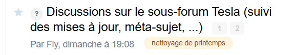 Mais il faudrait modifier leur fonctionnement. Actuellement chacun est libre de choisir ce qu'il veut, erreurs d'orthographe comprises, ce qui fait que cela a vraiment peu d'utilité. Avec un nombre restreint et prédéterminé cela a plus de sens je trouve. Cela permet un affichage clair et aussi une recherche qui retourne des résultats. Il pourrait y avoir plusieurs niveaux éventuellement avec tout en haut un choix obligatoire et très limité (pour le forum Model 3 - Model Y): Rien (pour les sujets communs au deux modèles) Model 3 Model Y En dessous il pourrait y avoir des tags optionnels, là aussi prédéfinis mais évolutifs, comme "pneus", "peinture"... Et il faudrait une couleur qui pète un peu plus pour le premier niveau ! -