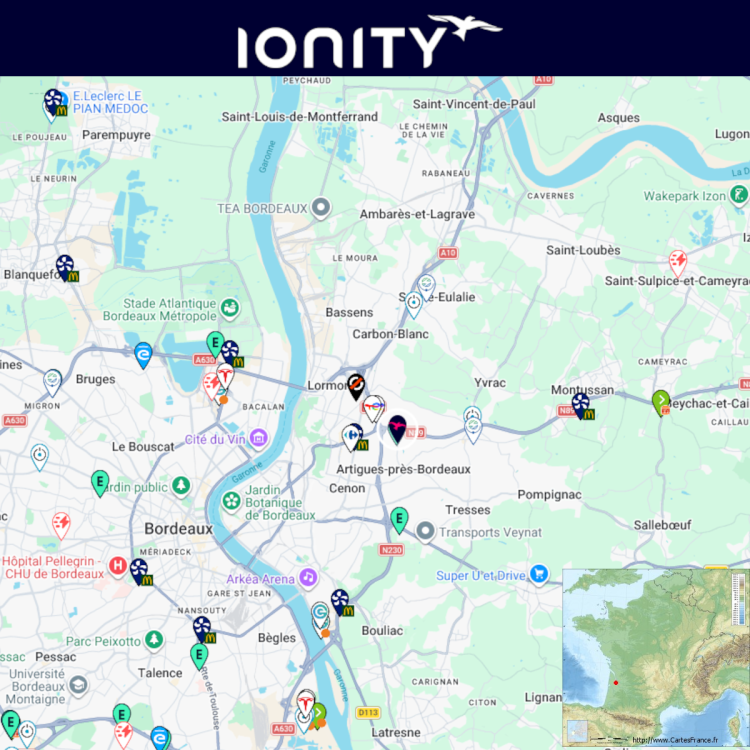 Ouverture d'une station Ionity à Artigues-près-Bordeaux. 4x 400kW CCS 2x 350kW CCS Comme d'habitude, retrouvez le lien vers ma carte : https://tinyurl.com/StationsVE Toute l'actu des stations de recharge sur le groupe FB : https://tinyurl.com/GroupeFacebookVE -