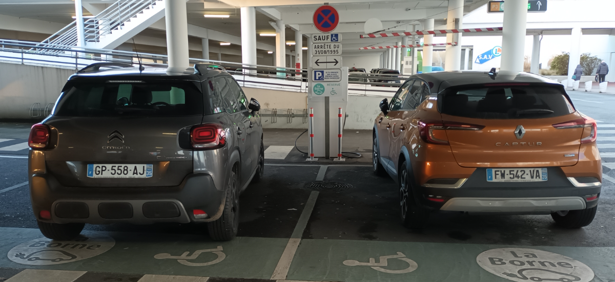 😄 Oui C'est un "ou" non exclusif bien sûr ! On accepte les handicapés en voiture électrique ! Il y a une borne en dessous ? Les anti-ve y verront sans doute un double affichage inutile... -