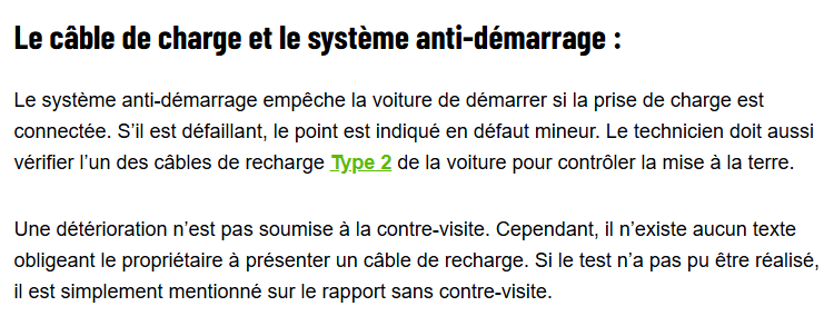 effectivement, le câble de charge ici est utilisé afin de tester le fait que la voiture n'avance pas lorsqu'un câble est branché mais aussi afin de contrôler la mise à la terre. AP avait fait un article à ce sujet L'un comme l'autre, je trouve encore une fois cela très étonnant que le CT ne soit pas équipé afin de le contrôler par lui même et cela pour plusieurs raison : de plus en plus les câbles sont en option - même si ok, beaucoup sont équipés du T2/T2 contrôle de la mise à la terre - si défaut qui est en faute, le câble ou la voiture? alors oui ce n'est pas un motif de contre-visite, qui mériterait de l'être notamment si cela vient de la voiture - potentiellement dangereux. Ici, cela devrait être contrôler séparément si on veut que le test soit un poil logique et utile.