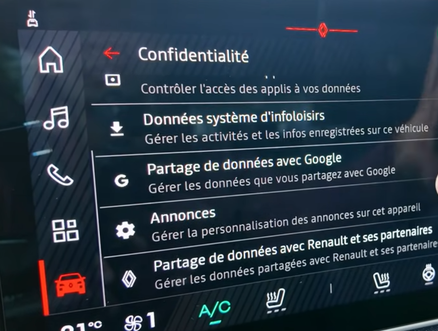Normalement, ça devrait se trouver ici : Après avoir sélectionné l'icône de la voiture tout à gauche, menu Réglages > Confidentialité > Partage de données avec Renault et ses partenaires (désolé pour la qualité, j'ai capturé l'image depuis une vidéo) Et si l'étoile est toujours présente, voir peut-être aussi "partage de données avec Google".
