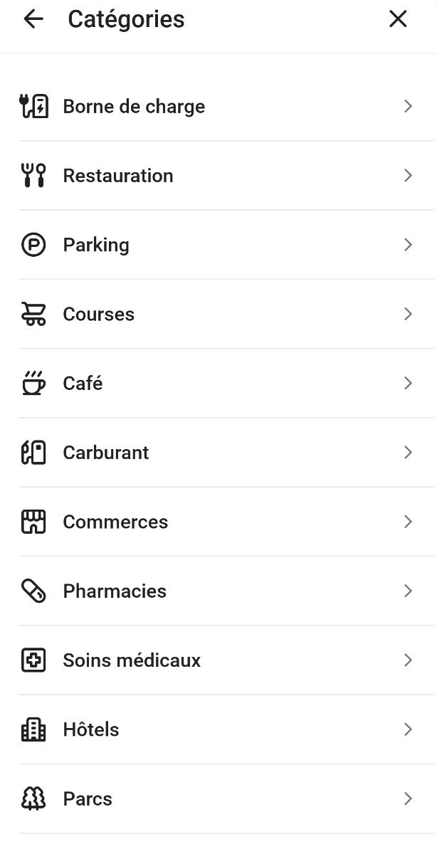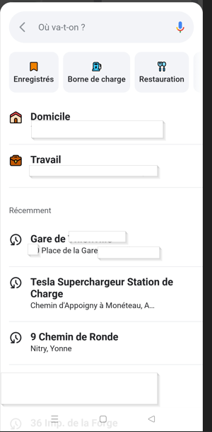 Je reviens sur le sujet pour 2 petits points a) l'aire de la chaponne que je ne souviens pas avoir vue, peut être était elle inaccessible elle aussi - pour rappel on roulait sur une voie de l'autre côté de la rambarde de sécurité b) je viens (si on peut apprendre de ses erreurs !) de découvrir que waze permettait de voir toutes les bornes de recharges ( et je suppose de nous y mener) dès qu'on clique sur où va t on ail est aussi possible d'y rechercher plein d'autres choses ... screen shots en annexe !
