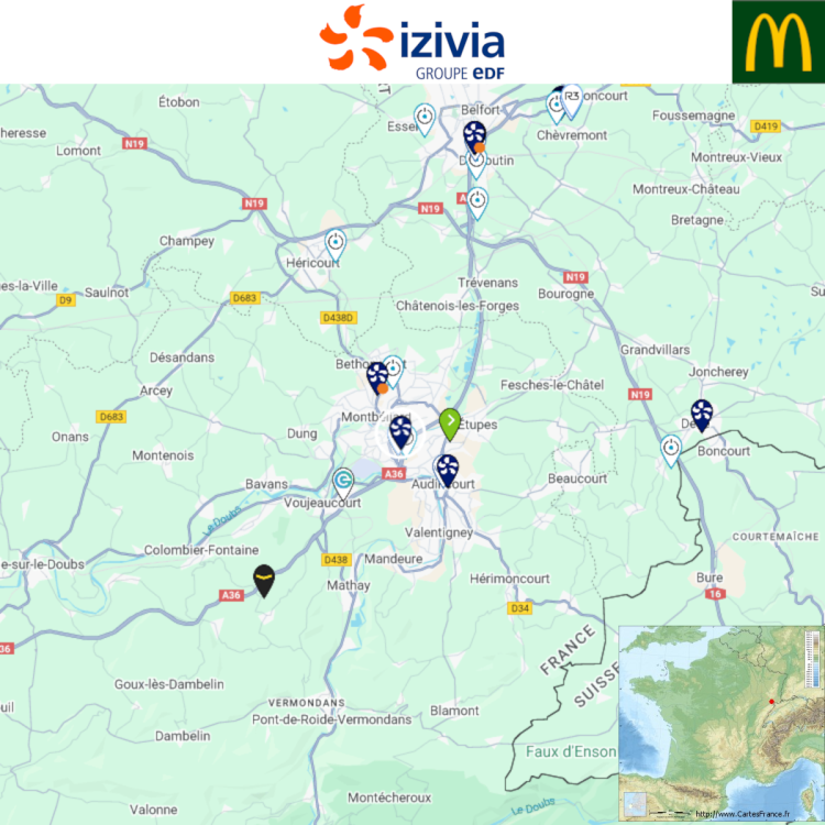 Ouverture d'une station Izivia à Montbéliard (McDonald's). 2x 150kW CCS Comme d'habitude, retrouvez le lien vers ma carte : https://tinyurl.com/StationsVE Toute l'actu des stations de recharge sur le groupe FB : https://tinyurl.com/GroupeFacebookVE -