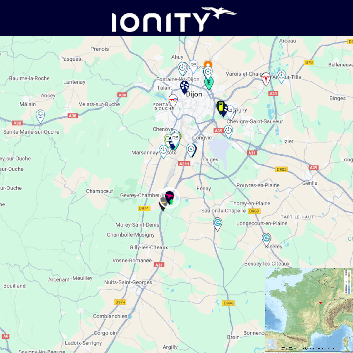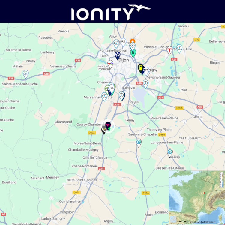 Agrandissement terminé d'une station Ionity sur l'A31 - Aire de Gevrey - Chambertin Est. 4x 400kW CCS 4x 350kW CCS 2x 200kW CCS 1x 50kW tristandard Comme d'habitude, retrouvez le lien vers ma carte : https://tinyurl.com/StationsVE Toute l'actu des stations de recharge sur le groupe FB : https://tinyurl.com/GroupeFacebookVE -