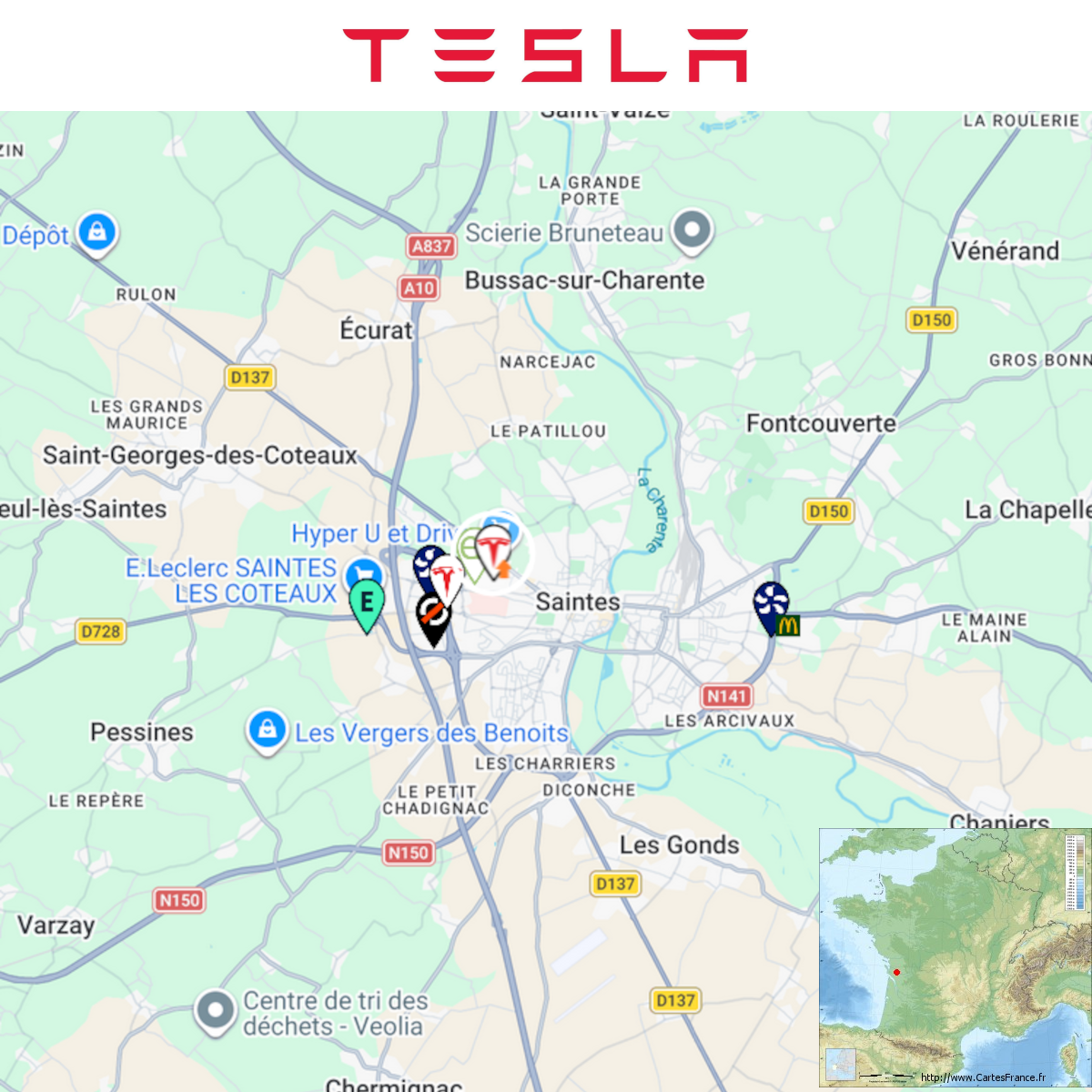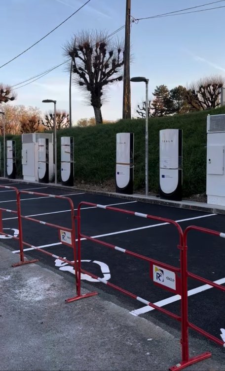 Agrandissement en cours d'une station Tesla à Saintes (Hyper U) Photo de Philippe B. sur FB. Ajout de 8x 250kW CCS Comme d'habitude, retrouvez le lien vers ma carte : https://tinyurl.com/StationsVE Toute l'actu des stations de recharge sur le groupe FB : https://tinyurl.com/GroupeFacebookVE