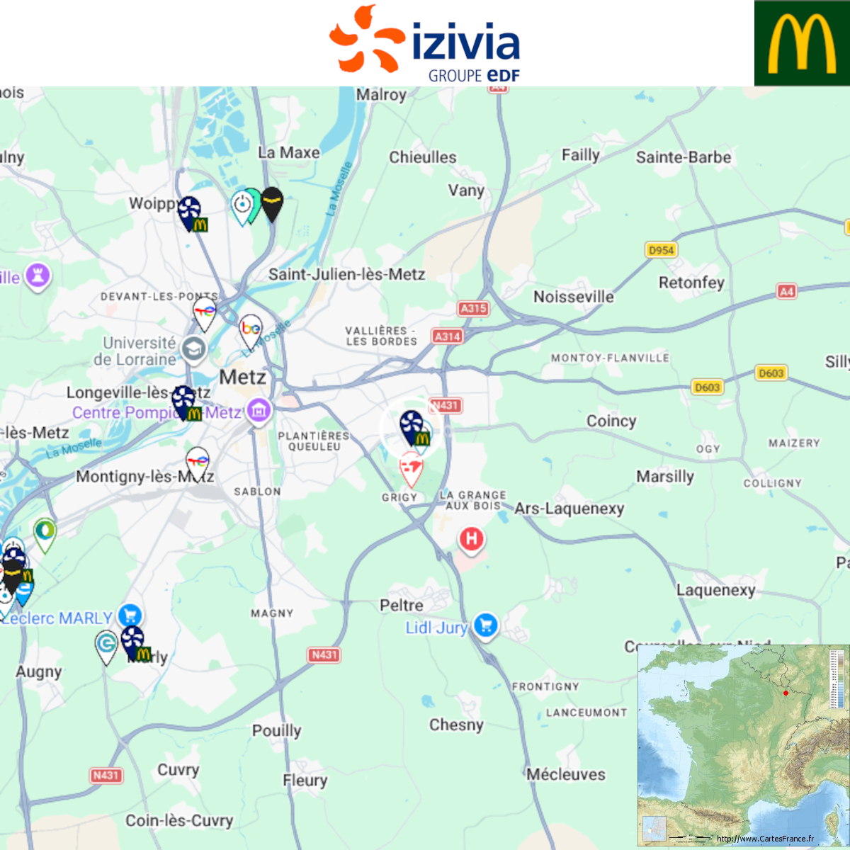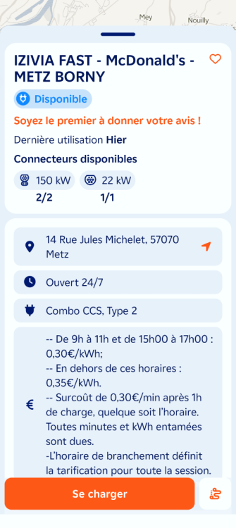 Ouverture d'une station Izivia à Metz (McDonald's). 2x 150kW CCS Comme d'habitude, retrouvez le lien vers ma carte : https://tinyurl.com/StationsVE Toute l'actu des stations de recharge sur le groupe FB : https://tinyurl.com/GroupeFacebookVE -