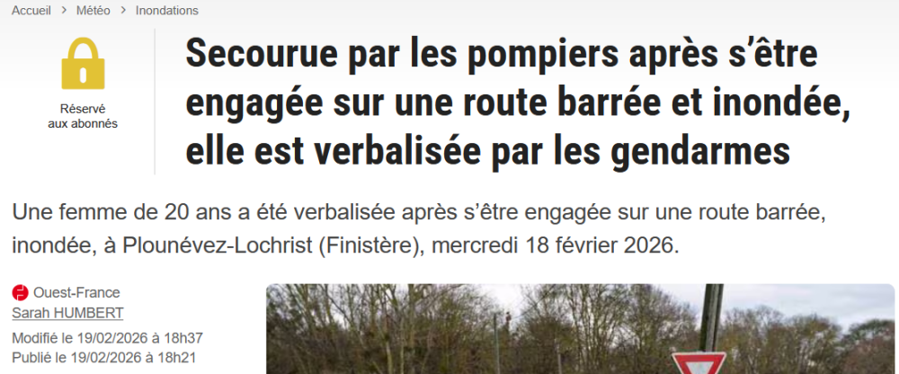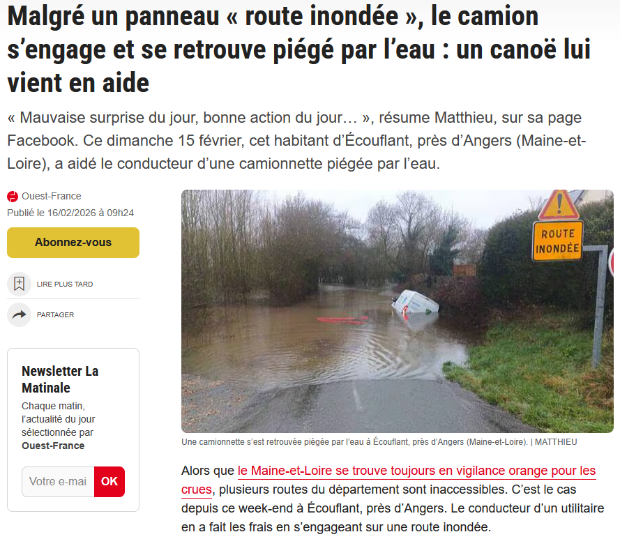 On a des dizaines d'articles dans le même style (automobilistes qui se pensent plus forts, plus malins que les inondations). source du second en accès libre : https://www.ouest-france.fr/meteo/inondation/malgre-un-panneau-route-inondee-le-camion-sengage-et-se-retrouve-piege-par-leau-un-canoe-lui-vient-en-aide-a045a524-0b0c-11f1-8f27-f38523081a88