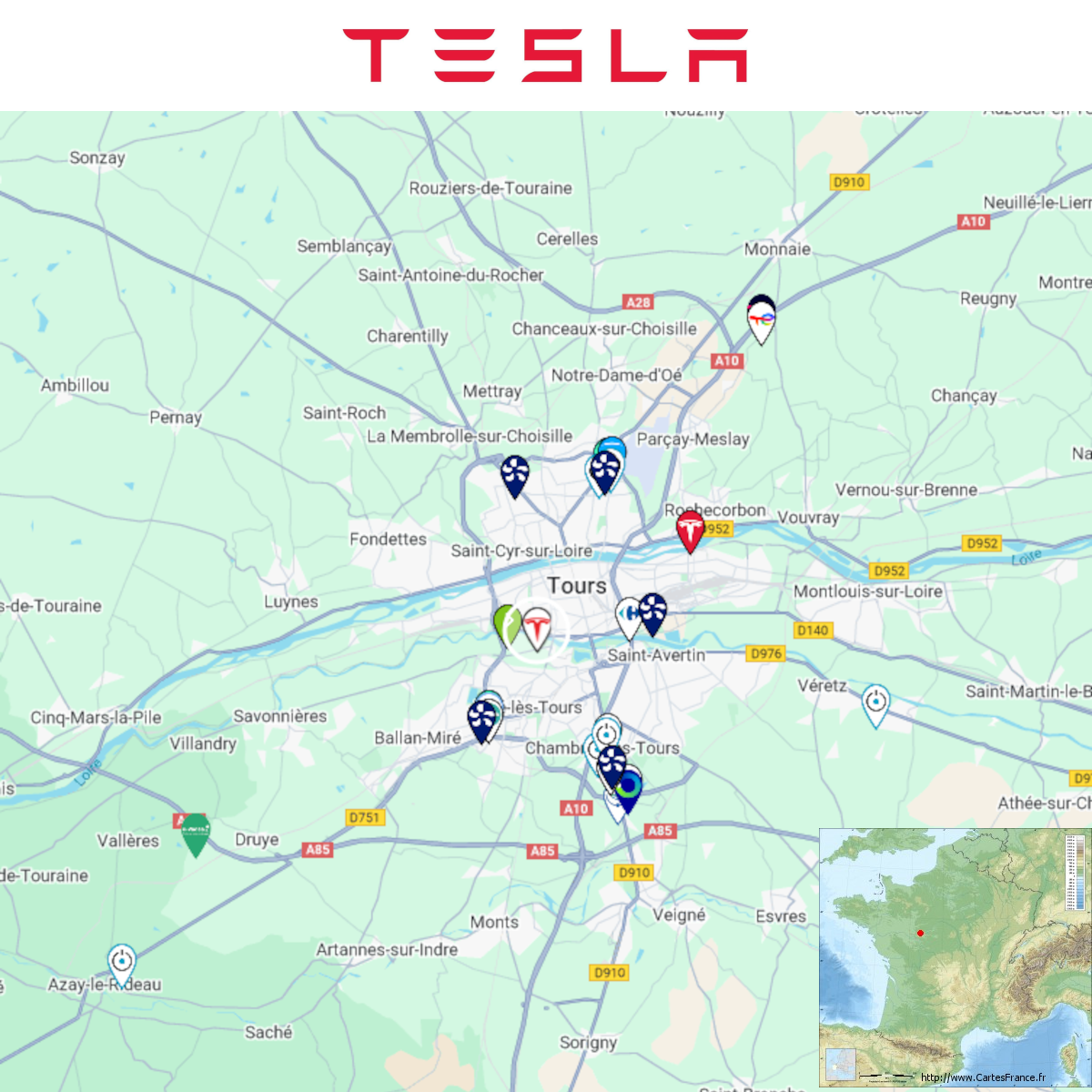 Ouverture d'une station Tesla à Tours (Grand Frais). 6x 250kW CCS Prix sans abonnement/non Tesla sur la capture Comme d'habitude, retrouvez le lien vers ma carte : https://tinyurl.com/StationsVE Toute l'actu des stations de recharge sur le groupe FB : https://tinyurl.com/GroupeFacebookVE -