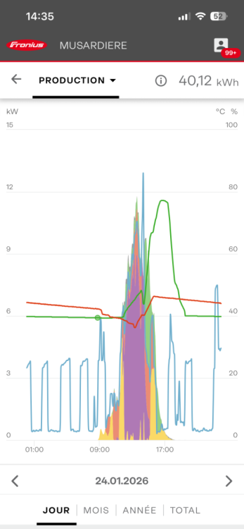 5 kW n’est pas si mal. Que veut dire pour n’ont pas la bonne direction ? Le nord ok c’est pas bon, mais une installation Est et Ouest n’est pas mauvaise en soit surtout avec un prix des modules qui restent encore faible. Pour avoir un pic élevé oui c’est pas le mieux mais avoir une production qui démarre tôt et fini plus tard qu’une expo Sud c’est mieux pour l’autoconsommation. si je peux me permettre sur les onduleurs moderne aujourd’hui on peut surdimensionner à 50% voir 100% la puissance des modules. cad pour un onduleur de 6kW on peut mettre 9 voir 12 kWc de modules. Cela permet à l’onduleur de démarrer plutôt avec un faible ensoleillement. ce qui est apparemment le problème de Seguil69 en hiver. De mon côté j’arrive à faire des recharges y compris en décembre et en janvier à faire des recharges de la voiture jusqu’à 20 kWh dans une journée et même à en mettre sur la batterie stationnaire et faire de l’eau chaude dans la même journée. -