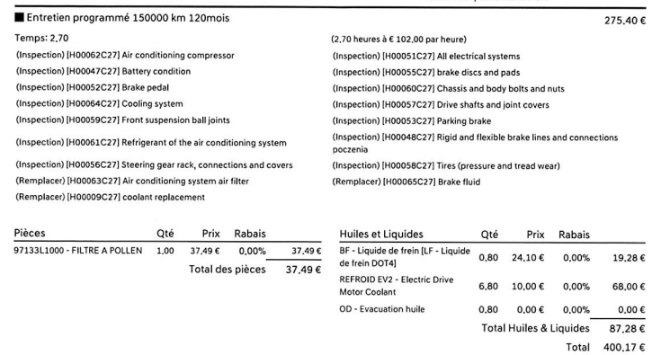 bonjour, je commence a prospecter pour la révision des 5 ans ( dans 3 mois ) , sachant que j' ai deja 165 000kms . la concession ( pour ceux qui me suivent, oui je suis maso d'y retourner ) , m'a fait un devis de 480€ .... vous avez de meuilleurs prix dans la region de lyon ( a plus ou moins 200kms ) ? @Kadargo je vais demander a ta concession, meme si ca me fait de la route . voila ce qui est 'prévu' d apres ma concession ( c'est HT ) en gros remplacement filtre a air, liquide de refroidissement , liquide de frein ....(soit 125€ ht/ 150€TTC de matos ) tout le reste c est de l inspection .... sachant que la voiture en est probablement à sa 10ieme visite en concession depuis mai 2025 .... j espere bien qu elle a déja eté inspectée sous toutesles coutures 😛 bref , la tesla sans entretient me fait de plus en plus de l oeil////