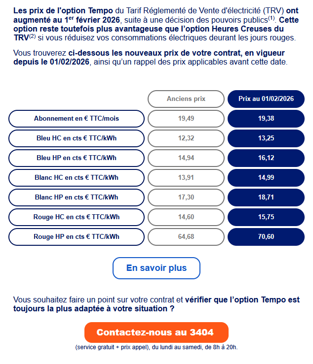 Bonjour à tous, N'ayant pas parcouru l'intégralité des 123 pages de ce sujet, je me suis concentré sur les dernières dizaines de messages. Je suis actuellement abonné à l'option EDF Tempo 9kW et j'en suis, pour l'instant, satisfait. Je vois passer plusieurs recommandations suggérant de quitter Tempo pour des fournisseurs alternatifs. Pourriez-vous apporter un peu plus de précisions sur ces offres réellement avantageuses ? J’aimerais une vision d'ensemble plutôt que des retours isolés annonçant, par exemple, une économie de 1 ou 2 % sur un cas de figure très spécifique. En examinant ma propre situation, je constate qu'en Heures Pleines bleues (ma période de consommation principale), le tarif de 16,12 cts € reste très compétitif par rapport au tarif de base qui avoisine les 19.27 cts €. Qu'est-ce qui rend les autres fournisseurs si exceptionnels selon vous ? Mes recherches auprès de la concurrence m'ont laissé une impression d'opacité : on y promet souvent des économies sans expliquer clairement le mode de calcul, à grand renfort de pourcentages flous. Personnellement, je préfère m'appuyer sur une grille tarifaire transparente comme celle-ci (voir image) pour comparer efficacement. Merci d'avance pour vos éclairages ! -