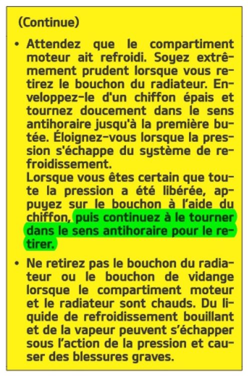 Cela reste assez aléatoire de mon côté, à midi après avoir fait 2 km ce matin, j'ai ouvert le réservoir du liquide refroidissement, il y avait un peu de pression mais sans plus, le niveau au maxi qui ne bouge pas, alors que la batterie ne devait pas être plus chaude que la température ambiante, à la remise en marche j'ai à nouveau eu le message. Là (17h45) j'ai voulu vérifier si en ouvrant le réservoir et en mettant la climatisation j'avais un phénomène (bulles ou montée du niveau) mais non, rien; j'ai coupé et remis le contact et hop plus de défaut ... Question que je me suis posé en refermant le bouchon, en fin de vissage il y a un cran avec l'étiquette qui se retrouve dans l'axe des roues avant, puis on peut encore visser un peu à fond, faut il le faire ou laisser le bouchon sur le cran pour que ça puisse dégazer au besoin ? D'ailleurs au passage, il y a bien une "coquille" dans la notice, ce n'est pas dans le sens "antihoraire" mais dans le sens horaire (pas à gauche) qui faut dévisser le bouchon. -