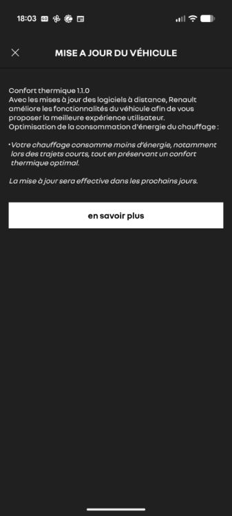 Tiens, on en parlait récemment et j'ai vu ce message dans l'appli MyRenault. Une mise à jour serait déployée prochainement pour optimiser la conso du chauffage. On sort de l'hiver avec un pied déjà dans le printemps, quel sens du timing 😁 Espérons que cette mise à jour corrige d'autres petits problèmes également 🤞🏻