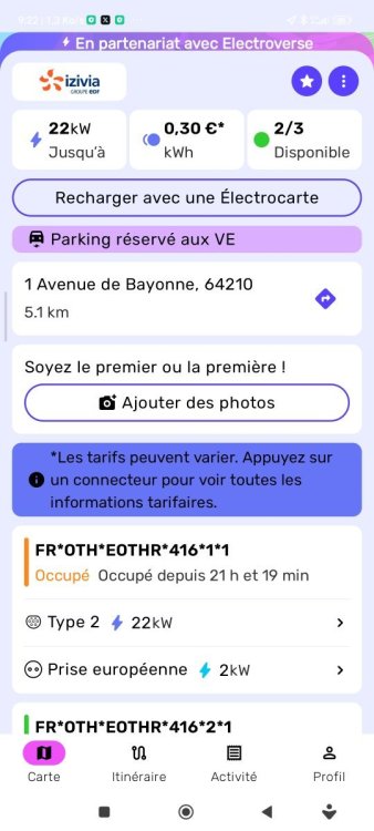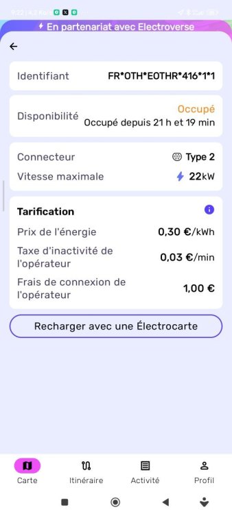 Bonjour @chgros1 Je pensais aller vérifier la gratuité annoncée par Electroverse sur les bornes proches de chez nous... Cela est inutile : La mention surlignée en bleu sur la page Electroverse pour les bornes annoncées à 0€, précise "d'appuyer sur le connecteur de la borne choisie"... Cela se fait directement sur la-dite page de l'application...I il suffit 🥴 de cliquer sur le numéro d'un des connecteurs connecteur pour voir le tarif détaillé mis à jour. En l'occurrence, pour les bornes Intermarché Bidart, par cette seule action, on est passé de 0€ à 1€ au branchement + 0.30€/kWh... 😵💫... Attention, le prix au kWh affiché dans l'appli Electroverse en haut de la page de la station (0.30€) doit elle aussi être vérifiée : - Cliquer sur le connecteur choisi, - puis sur le type de connecteur prévu (T2 ou shuko...) ce qui nous donne plus de détails..., savoir : + 1€ au raccordement, + 0.30€/kWh, + 0.10€ d'occupation... Tout est alors clair, et réduit ainsi les besoins de déplacements vers telle ou telle autre station de recharge... C'est long et fastidieux, mais précieux... -