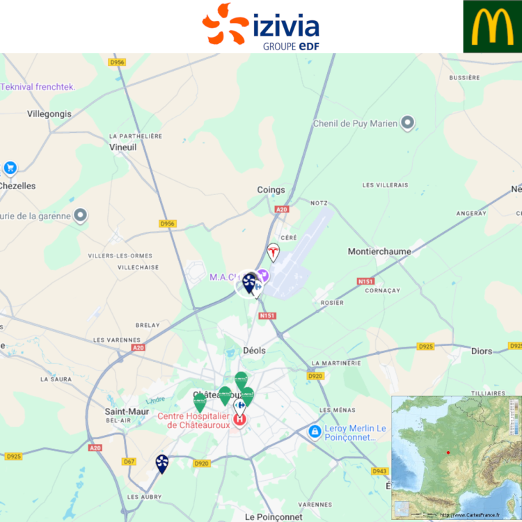 Ouverture d'une station Izivia à Déols (McDonald's), le long de l'A20. 4x 150kW CCS Comme d'habitude, retrouvez le lien vers ma carte : https://tinyurl.com/StationsVE Toute l'actu des stations de recharge sur le groupe FB : https://tinyurl.com/GroupeFacebookVE -