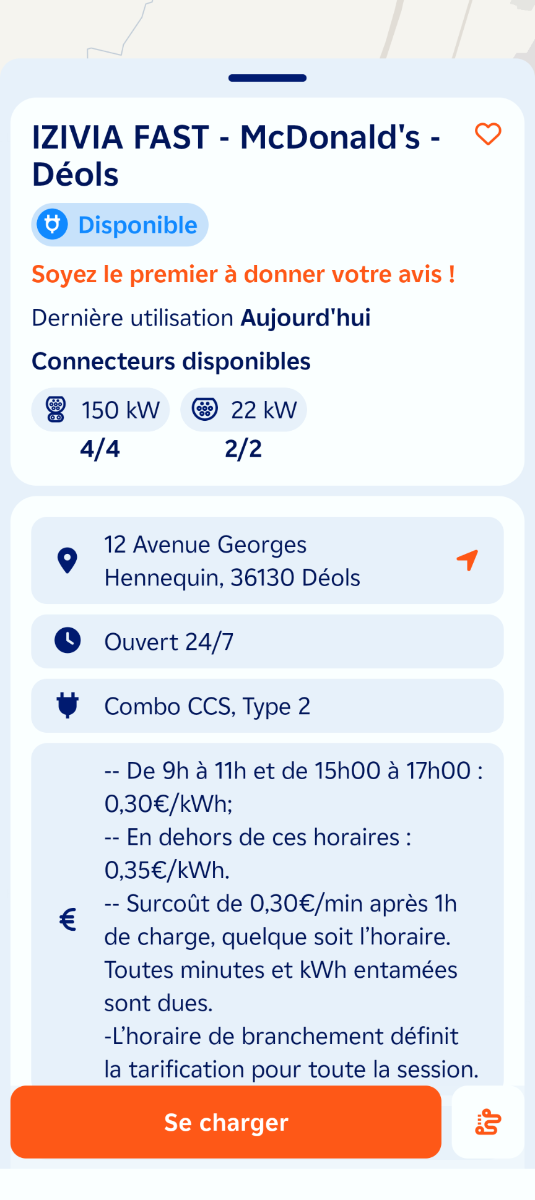 Bonjour. J'ai fait ma première recharge, sur le réseau Mobilize, à Toulouse. Très satisfait du tarif, par rapport aux autres stations. Le seul soucis, c'est qu'il y a très peu de stations; surtout dans le sud-ouest. Rien entre Bordeaux et Toulouse (à part un détour par Montauban, et encore au nord). Et rien entre Toulouse et Narbonne. -