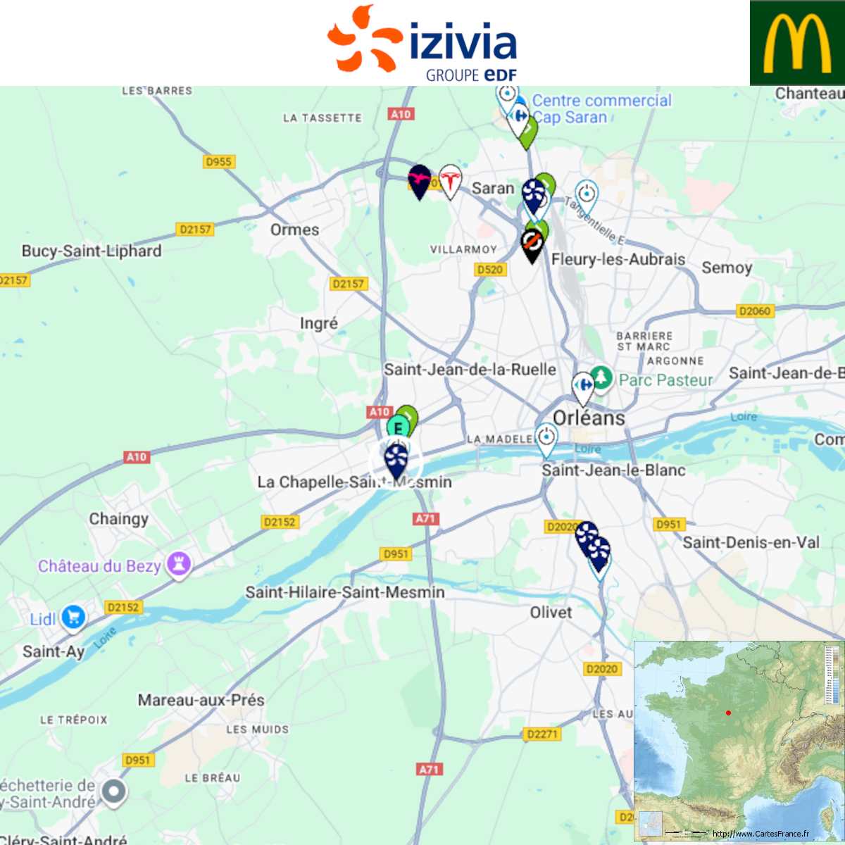 Ouverture d'une station Izivia à La Chapelle-Saint-Mesmin (McDonald's), le long de l'A21. 2x 200kW CCS Comme d'habitude, retrouvez le lien vers ma carte : https://tinyurl.com/StationsVE Toute l'actu des stations de recharge sur le groupe FB : https://tinyurl.com/GroupeFacebookVE - Aujourd’hui