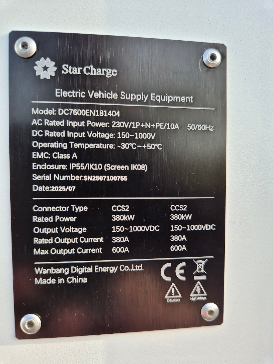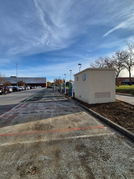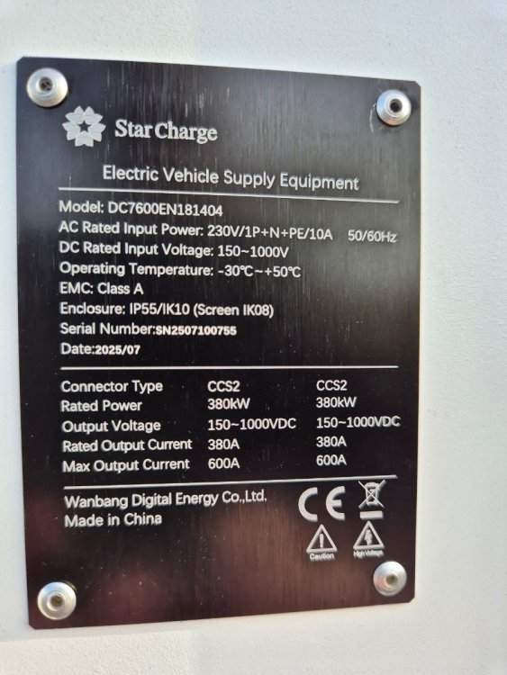 Voila l'info : les bornes 22 kW : Etrel Et pour les 600 kW : Détail des bras en tête qui se déplient ,pas mal vu ,car le poids des cables vu le diamètre !!! Vue d'ensemble : 4 bornes 22 kW +4 bornes 600kW : -