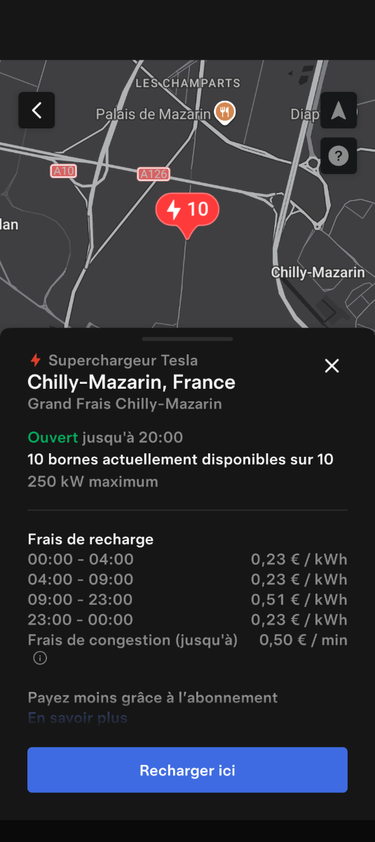Ouverture d'une station Tesla à Chilly-Mazarin (Grand Frais). 10x 250kW CCS Prix sans abonnement/non Tesla sur la capture Comme d'habitude, retrouvez le lien vers ma carte : https://tinyurl.com/StationsVE Toute l'actu des stations de recharge sur le groupe FB : https://tinyurl.com/GroupeFacebookVE