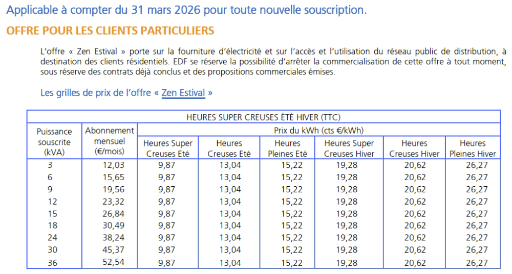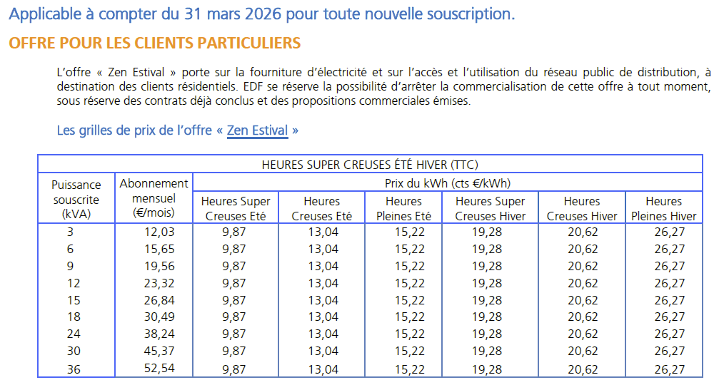 Passez à EDF "Zen Estival", désormais le moins cher de toutes les offres possibles (jusqu'à l' "hiver" le 31/10): 0.0987 €/kWh au plus bas (pic solaire en journée), et 16 heures creuses en tout, imbattable 🙂: 7 heures super creuses tous les jours d’avril à octobre, de 11h à 18h, pour profiter de la forte production solaire, une énergie renouvelable à moindre coût. 9 heures creuses pendant la nuit de 22h à 7h, quand la demande en électricité est la moins importante. -