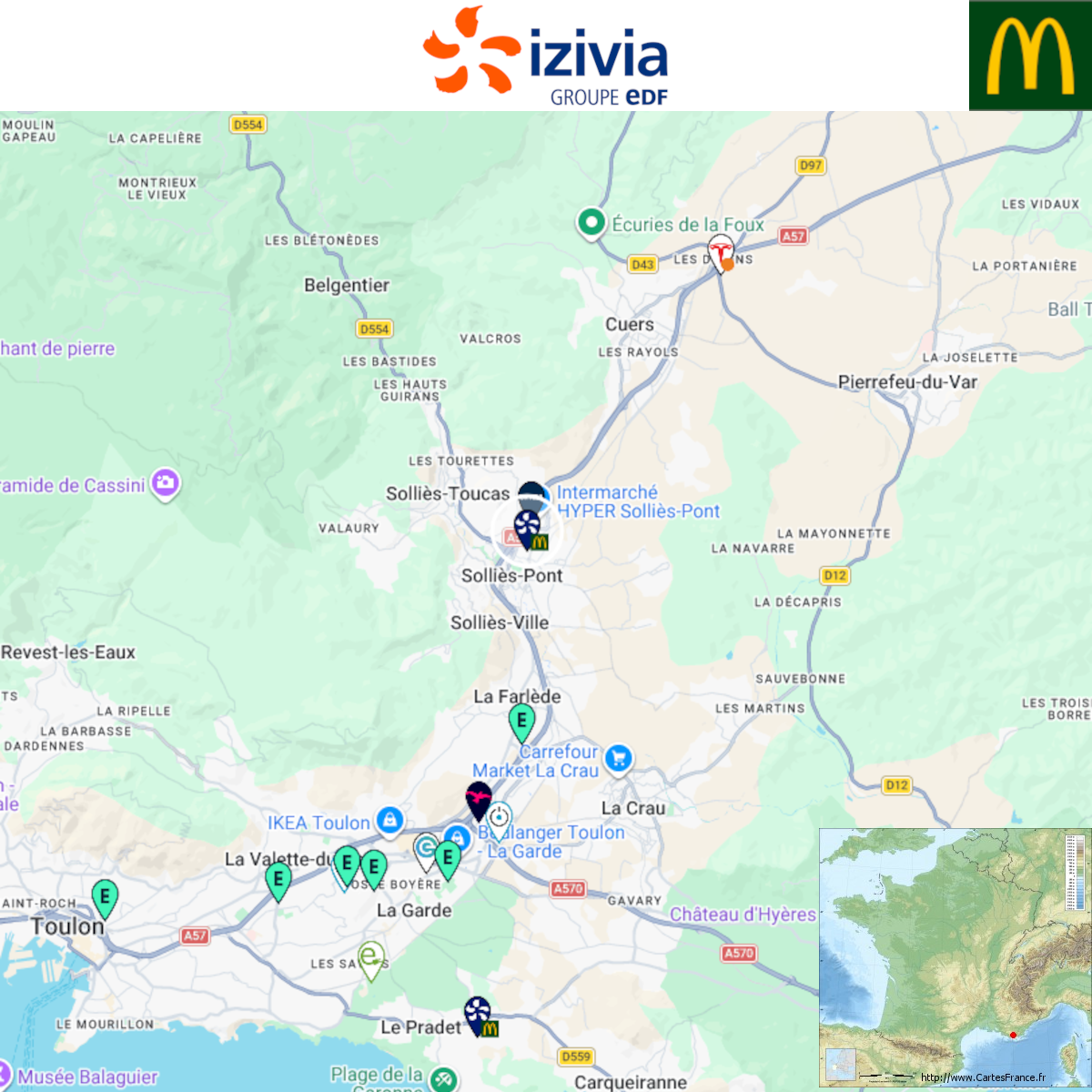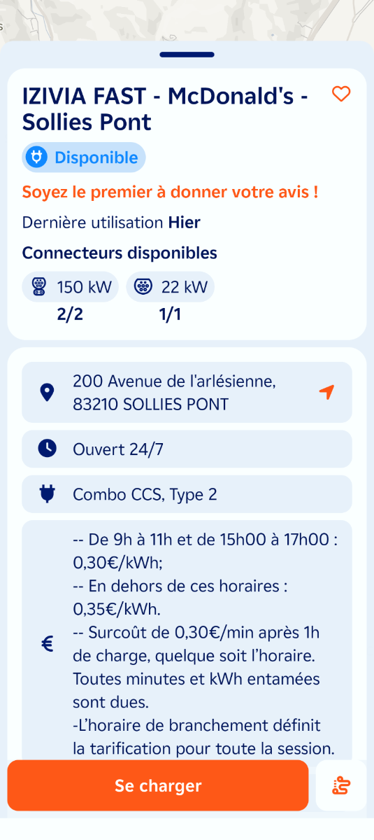 Ouverture d'une station Izivia à Solliès-Pont (McDonald's). 2x 150kW CCS Comme d'habitude, retrouvez le lien vers ma carte : https://tinyurl.com/StationsVE Toute l'actu des stations de recharge sur le groupe FB : https://tinyurl.com/GroupeFacebookVE -