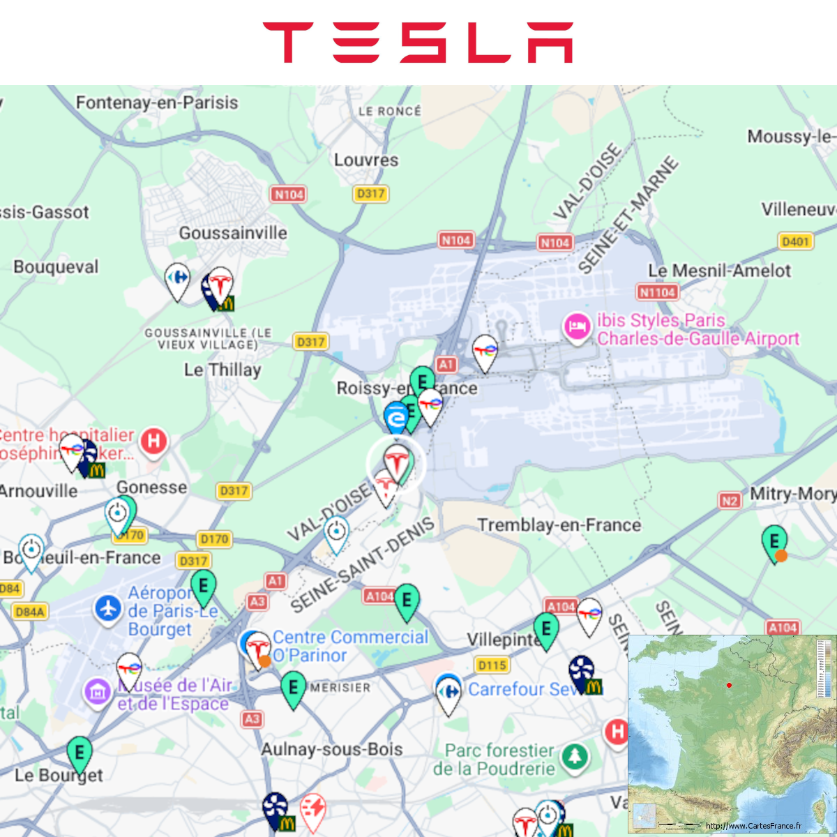 Ouverture d'une station Tesla à Roissy-en-France (Restaurant Van der Valk). 12x 250kW CCS Prix sans abonnement/non Tesla sur la capture Photo de jpz68 Comme d'habitude, retrouvez le lien vers ma carte : https://tinyurl.com/StationsVE Toute l'actu des stations de recharge sur le groupe FB : https://tinyurl.com/GroupeFacebookVE -