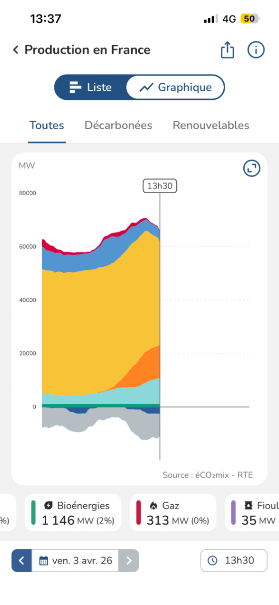 Enfin la France a commencé à réduire sa consommation de gaz pour sa production d’électricité en ce début avril. voir ci dessous. Il faut dire que l’on été arrivé à une absurdité sans nom! Brûler du gaz pendant des prix négatifs d’électricité où encore avoir arrêter des production photovoltaïque moins cher que le gaz où encore réduit la production nucléaire.Oui il y a des contrats absurdes qui finance de l’électricité avec du gaz sans même en avoir besoin. C’est absurde que l’on paye des installations gaz pour maintenir des capacités cela sens. Mais brûler du gaz pour payer des kWh quand on en a pas besoin et en plus payer les prix negatif Ses kWh produits au gaz déjà à prix d’or c’est insupprtable. il faut annuler ses contrats et ne payer que la maintenance. En fait il serait peut être temps de se posser la question de savoir si l’on a encore besoin de ses productions gaz aujourd’hui? Si tous nos réacteurs étaient en état en fonctionnement les 4 mois d’hiver comme le font certains pays comme la Suède, aurions nous vraiment besoin de brûler du gaz? La Suède a la réponse depuis des années déjà, c’est non! Alors ils ont un peu plus d’hydraulique que nous en proportion c’est vrais . Mais plutôt que de brûler des centaines de milliers d’€ de gaz en pure perte si on investissait sur du stockage stationnaire en gros quantité qui servirait les 4 mois d’hiver mais aussi toutes l’année. https://www.revolution-energetique.com/actus/pourquoi-brule-t-on-du-gaz-pour-produire-de-lelectricite-meme-quand-on-nen-a-pas-besoin/ -