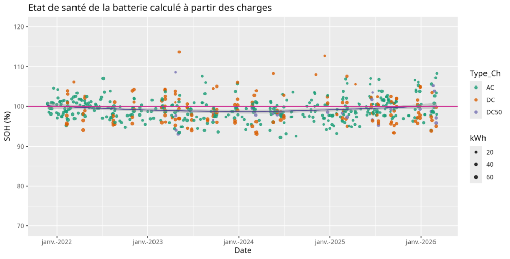 Eh bien ça, pour moi, c'est toujours discuté et discutable...je ne reviendrai pas sur les débats interminables qui ont égayé ce forum sur le sujet depuis 2021. Mais c'est un fait que lorsqu'on calcule la capacité de la batterie à la décharge comme tu le fais, ou en faisant le même calcul à partir des charges, on tombe invariablement sur une capacité en moyenne voisine de 77 kWh. Je rappelle aussi que Kia n'a jamais communiqué sur le sujet, en dehors d'indiquer le fait que la batterie de la Kia EV6 a une capacité de 77,4 kWh. Petit graphique pour illustrer le calcul de capacité à partir des charges sur la mienne. La valeur 100 correspond à une valeur de 77,4 kWh. Il y a de la variabilité, c'est certain, mais ce qui m'intéresse c'est la tendance moyenne.