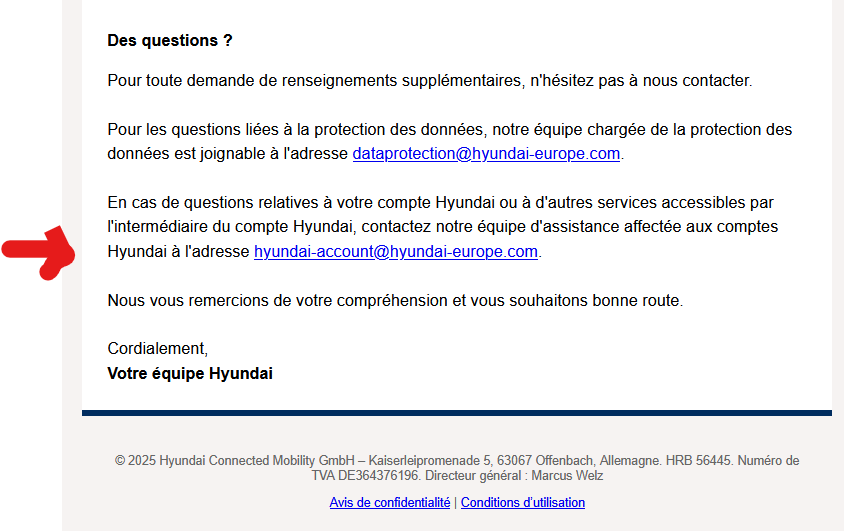 Salut okidok, As-tu réussi à les joindre ? Pour ma part, le paiement CB pour l'abonnement a échoué une première fois début août, puis il est passé immédiatement après, lors d'une seconde tentative. Sauf que leur système est tellement bien fait qu'entre les deux tentatives, mon abonnement a été résilié. Ils n'ont rien prévu pour gérer les erreur techniques lors du paiement. J'ai bien été prélevé de 29€ mais je n'ai plus d'abonnement. Cela fait quasiment deux mois que j'attends une solution. [email protected] semble mener vers une équipe au Canada, qui a mis 1 mois pour me répondre à côté de la plaque, notamment en me renvoyant vers un site aux USA et en m'invitant à souscrire à un offre payante si je veux réactiver mon abonnement... Entre temps, j'ai contacté Hyundai France qui semble ne rien vouloir/pouvoir faire et m'a simplement indiqué l'adresse [email protected] : j'ai eu une réponse un peu plus rapide sur cette nouvelle adresse mail. Ils ont confirmé que le paiement de 29€ était passé et m'ont demandé si je voulais un remboursement ou la réactivation de l'abonnement. J'ai naturellement demandé la réactivation. Ils m'ont indiqué transférer ma demande à leur équipe technique. J'attends depuis le 29 août. Plus aucune réponse à mes relances. Aucune réponse de Hyundai France. Mon concessionnaire m'a indiqué également l'adresse [email protected] aucune réponse. Il m'a fait comprendre que si je n'étais pas content du service Hyundai, je n'avais qu'à me taire car c'est pire ailleurs, d'après lui.... En attendant, le dossier est pris en charge par ma protection juridique... Pour résumer : il ne faut pas avoir d'incident de paiement avec Bluelink, ils ne savent pas gérer... -