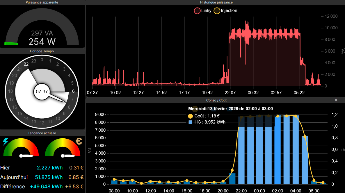 Depuis que javais installé la borne Leboncoin en plus de la prise green'up, je n'avais jamais chargé les 2 voitures toute une nuit en même temps. C'est la Green'up qui fonctionne en priorité. Hier soir, les 2 voitures étaient largement déchargées.... 8,9kWh de consommation durant chaque heure creuse ! Avec d'autres consommateurs tels que deux chauffages électriques (homecinéma et 1 chambre). Vers minuit on voit la régulation avec un instrument de cuisson qui préparait les viennoiseries du lendemain (quelques pics à 10kVA). On est large sur la tolérance Linky. La borne régule correctement. -