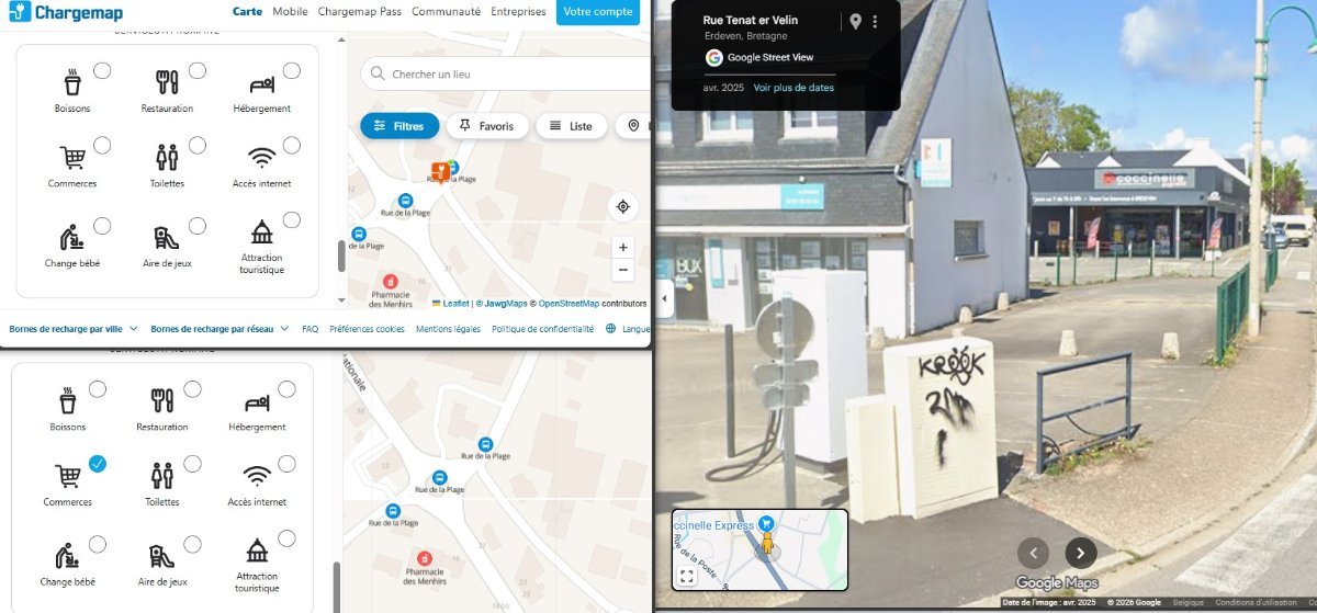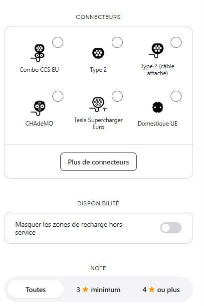 C'est aussi un filtre qui existe chez Chargemap mais j'avoue n'avoir aucune idée de la fiabilité de ces filtres, j'avais juste regardé ce que ça donnait en activant le filtre "restauration" ou ça affiche nettement moins de bornes mais le filtre "commerce" ne semble pas forcément correct puisque j'ai vu une borne près d'un magasin coccinelle express disparaitre de la liste en cochant "commerce" -