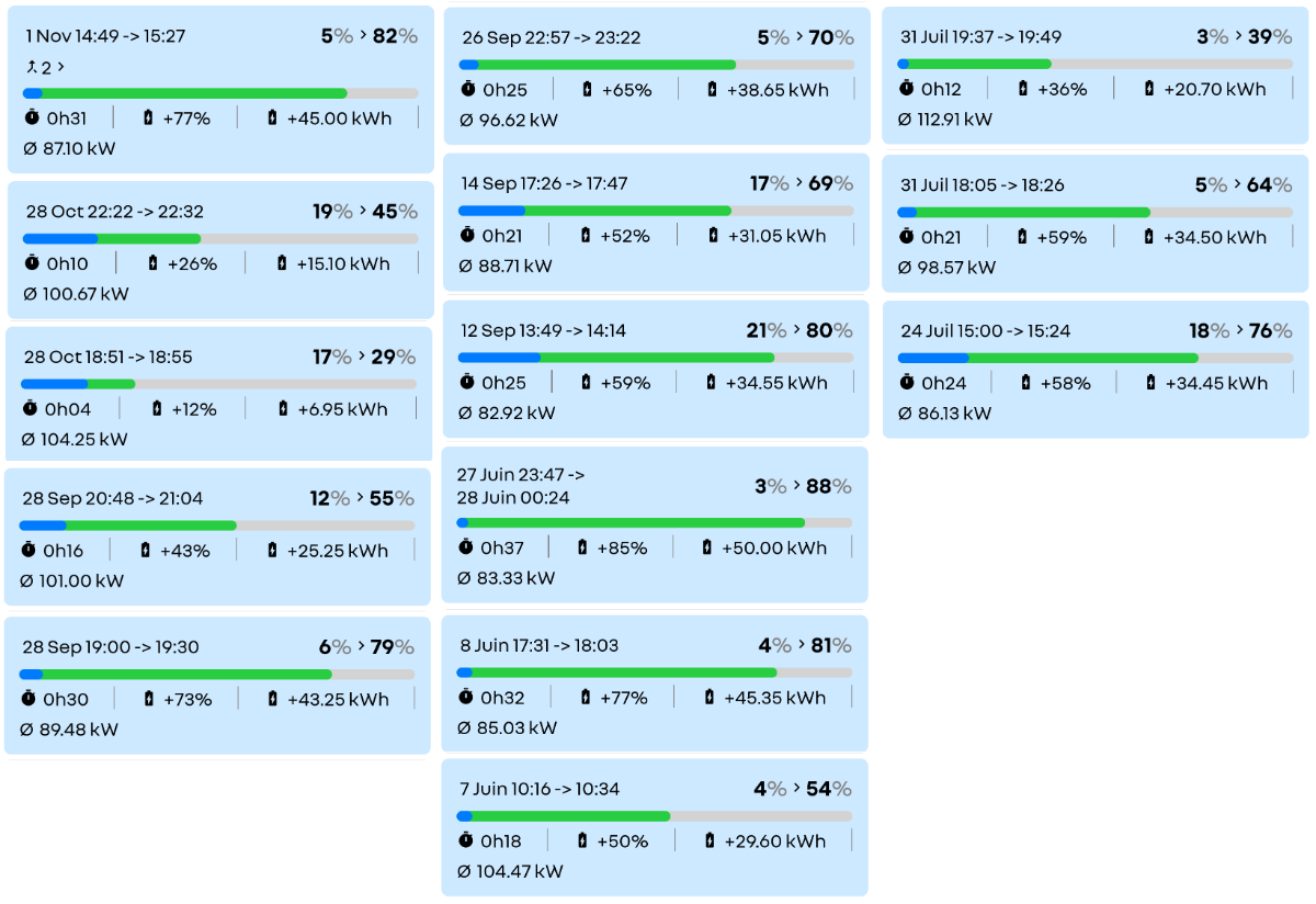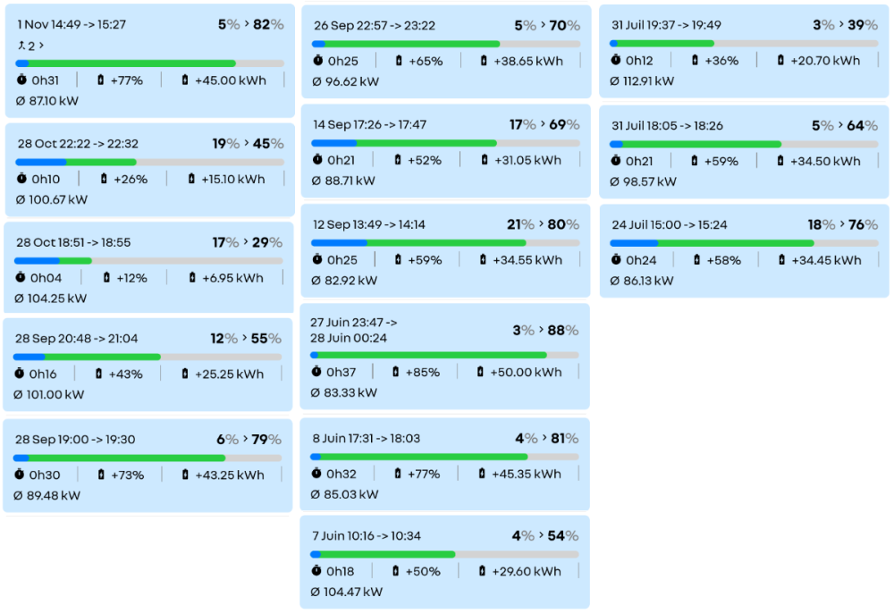 Voici mes dernières prouesses en 60 kWh J'obtiens systématiquement de meilleurs temps de charge par rapport à ceux annoncés par le constructeur : -