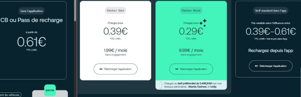 Bonjour, Effectivement Chargemap prend 10% de frais sur une recharge (mais c'est souvent une carte qui fonctionne pratiquement à tout les coup) Electroverse, ne prend pas de pourcentage donc est au prix affiché sur la borne. Il faut aussi voir si une application proposée par un opérateur ne vous permet pas de payer un peu moins que le prix client. Vous dites ne pas avoir besoin d'un abonnement, mais dans le cas d'un long voyage de temps en temps, certains opérateurs proposent des abonnements mensuels (je pense qu'il faut le désactiver si on ne veut pas qu'il soit prolongé). Par exemple l'opérateur de bornes Electra propose deux abonnements différents. - Le petit abonnement à 1,99€ par mois met le kW à 0,39€ en France (et à 0,49€ en Belgique mais seulement sur les bornes Electra. - Le gros abonnement à 9,99€ par mois met le kilowatt à 0,29€ en france (et à 0,39€ en Belgique mais permet également une ristourne chez plusieurs opérateurs partenaires (Ionity, Fastned, Atlante) à 0,49€/kWh en France (et 0,59 en Belgique ou 0,64€/kWh dans plusieurs pays Européens). Ils ont aussi des prix dépendant des heures de fréquentations depuis l'applications sans abonnement. On peut lancer une recharge directement depuis l'application sans avoir de carte RFID. Pour celui qui ne fait qu'un seul long voyage par an, il faut calculer si le gain est suffisant pour prendre l'abonnement à 9,99€ qui permet plus de souplesse puisqu'on peut s'arrêter chez plusieurs opérateurs sans payer le prix maximum. Il y a sans doute des systèmes similaires chez d'autres opérateurs mais je ne connais pas leurs conditions, je ne parle que de ce que je connais (et sans vouloir faire de pub). -