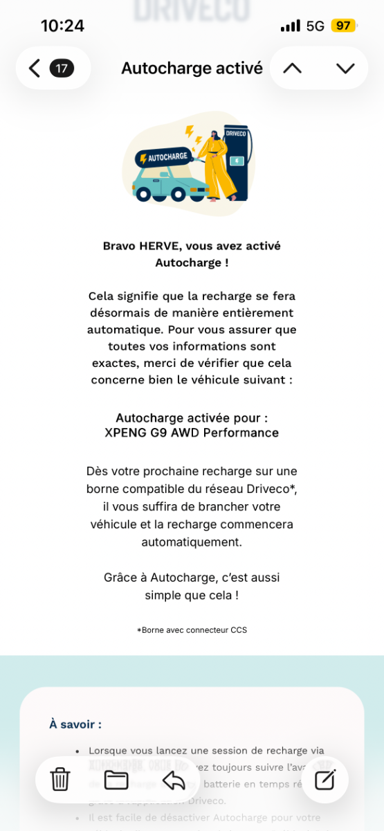 Aujourd’hui j’ai réussi à me faire reconnaître avec le G9 sur le réseau Driveco en effet j’avais rencontré des difficultés du à subtilité de la compliance Auto-charge chez Driveco le système n’est compatible qu’avec les bornes Driveco Carrefour Market. Ses bornes sont identifiées avec un petit identifiant vers sur la carte Driveco de leur application. Solution très pratique pour ceux qui ont cette enseigne à proximité de chez eux.😉
