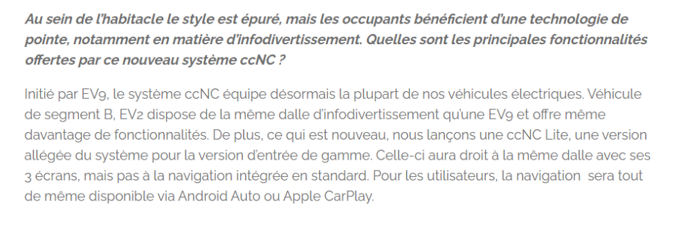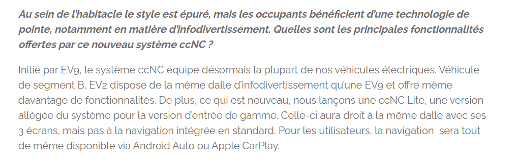 Chapeau pour le dossier . Je te crois bien volontiers , après nouvelle vérif. , sur la fiche technique Avril ,il est bien précisé ,pour le frunk ( Earth et Gt line) Comme dit au début , j'ai privilégié la monte 16" pour les pneus pour la conso et surtout meilleur confort ( avec mon dos ...) Et donc pour moi ,unique choix : version Air et seule possibilité de pack : navigation . Vraiment nul ,ce choix de Kia pour la France , de ne pas pouvoir piocher dans les packs ou choix de tailles pneus . Et le pire ,on n'aura pas droit en France à la version sièges coulissants . Autrement bien sur j'aurais pris la version Earth ,mieux équipée . Je n'aurais pas une surprise déplaisante , le frunk absent ,pas grave ,j'aime bien que "la mécanique " respire 😄 et voir les détails ...... J'ai commandé le 23/3 sans voir le VE ,en me basant uniquement sur les caractéristiques annoncées du véhicule sur la fiche technique . Et en comparant avec la petite cousine Inster ,donc pas de surprise pour moi ,ce sera Inster en mieux 😃 D'après les essais , on va avoir un super VE , avec une très belle autonomie pour ce gabarit . Et c'est ce que je souhaitais , davantage autonomie et aussi un peu plus de largeur au coudes par rapport à Inster .. Je te rejoins , comme d'habitude ,en concession est présentée toujours la version suréquipée ,difficile de savoir ce que l'on a exactement pour une version donnée . Comme dit sur les notices techniques : " caractéristiques techniques et équipements à titre indicatif ,voir le distributeur " Et le pauvre ...... qui est souvent pas plus au courant que nous ........