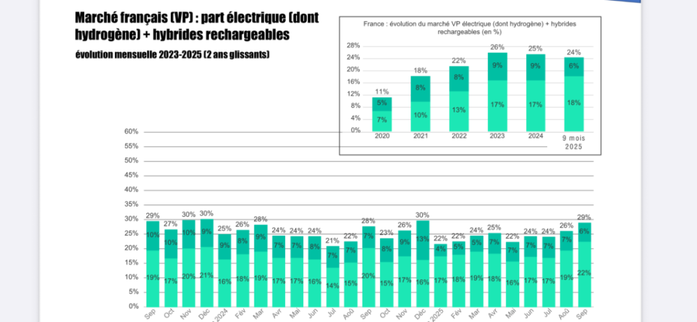 Voilà l’évolution de la part de marché des voitures électriques en France qui culmine en ce mois de septembre à 29%. Allez encore un petit effort pour arrivé à 33% d’ici décembre👌 -