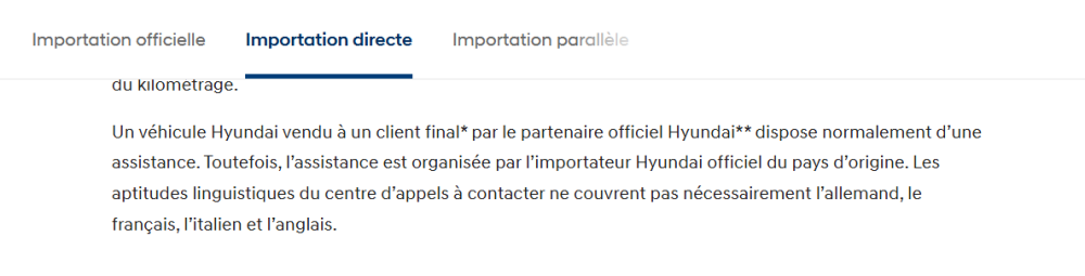 Eh oui ,seule la garantie légale 2 ans ,va s'appliquer dans ce cas : De plus , meme pour l'assistance pas évident , extrait de Hyundai Suisse : J'espère que ce ne sera pas le cas " assistance organisée par ... le pays d'origine " J'ai eu le tour avec Corsa e , provenance Italie : en cas de panne ,le bouton de service est connecté au centre de service , pays origine ,italien garanti .... Pas trop pratique . -