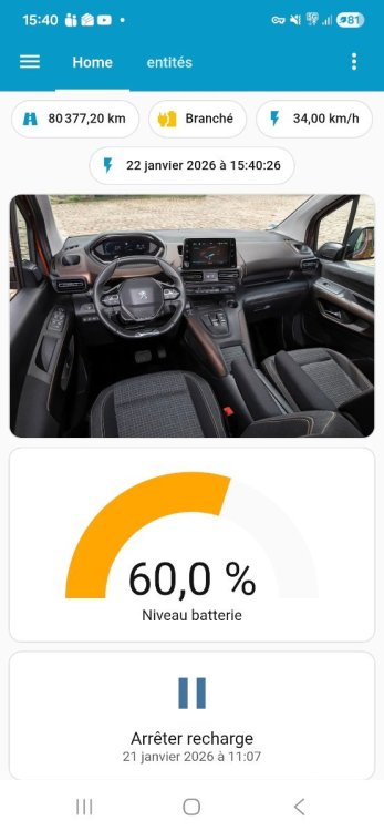 Voila le tableau de bord pour l'app que j'ai créé. C'est encore rudimentaire, il y a des gens qui font des trucs magnifiques mais là je découvre encore les possibilités. On ne le voit pas sur le screenshot mais il y a tous les boutons en scrollant. L'icone "branché" montre si la prise est branchée à la voiture (même si pas en charge). La vitesse en km/h, c'est la vitesse de charge, elle n’apparaît que si la voiture est en charge. Le pourcentage batterie change de couleur en fonction du % (entièrement paramétrable). Ah oui, il est aussi possible de récupérer la position de la voiture (même si on n'est pas dedans, ce que ne permet pas l'app) -