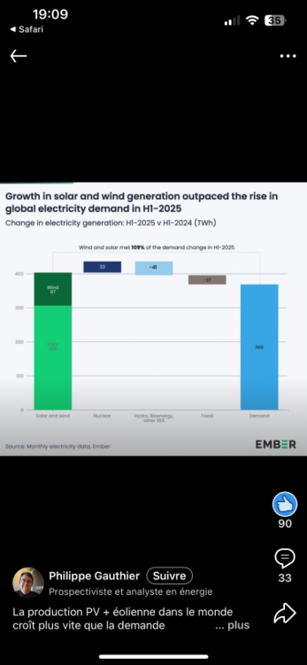 https://www.linkedin.com/posts/philippe-gauthier-analyste_la-production-pv-éolienne-dans-le-monde-activity-7393346729485553664-hdvT?utm_source=share&utm_medium=member_ios&rcm=ACoAABPob0YBtorDRELEOuHGbxqFzjbn5Je6fYI « La production PV + éolienne dans le monde croît plus vite que la demande électrique et remplace bel et bien de la production fossile. Le graphique compare le premier semestre de 2025 ou premier semestre de 2024. Le remplacement est encore lent, mais il va s'accélérer en même temps que le rythme d'installation des renouvelables. Chose certaine, cela contredit une fois de plus tout ceux qui prétendent que les renouvelables ne font que s'ajouter, sans rien remplacer - et qu'il en sera toujours ainsi. » je vois bien 27 TWh de fossiles. Je ne rêve pas! - Aujourd’hui