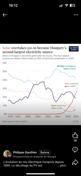 Baisse du charbon et du gaz en Hongrie pour la production électrique la encore c’est bien une réalité. Cornam nous avait informé de l’impressionnante mutation sur le photovoltaïque il y a quelques semaines. Les courbe sont imparable effectivement. Il faut bien que ses chiffres mondiaux indiscutable trouvent une origine😉 c’est bien imparable la baisses des fossiles. Bon la il y a en plus une baisse du nucléaire. Il faut dire que maintenant il est de plus en plus difficile de se fournir du combustible sous la patte d’un cheval. Alors effectivement réduire le recours au nucléaire permet d’économiser du combustible et de prolonger la durée de vie des centrales. Il y a aussi du bon sens chez nos pays européens. En France …😢😭 on rase gratis sur les retraites.🥵 -