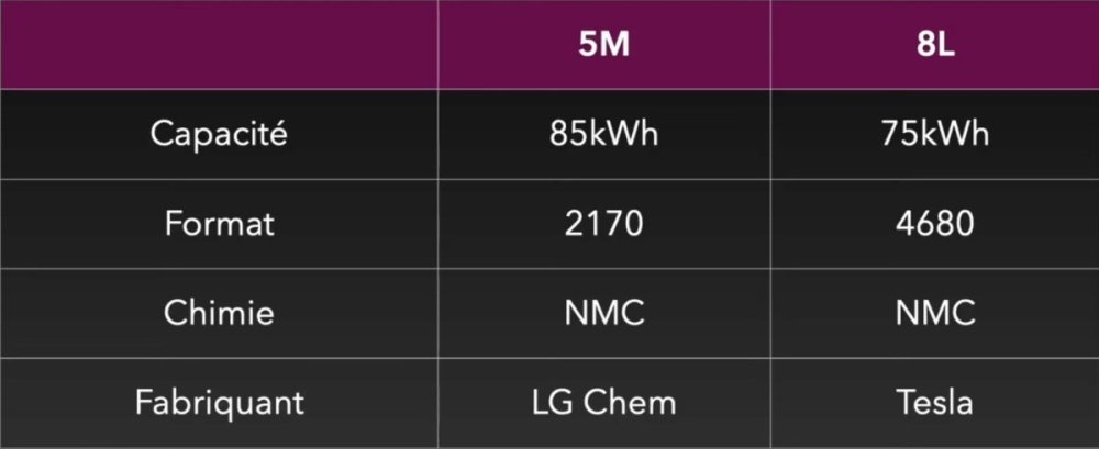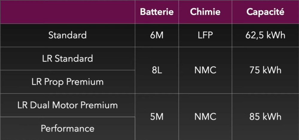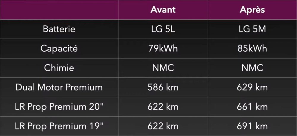 Un exemple bien frappant, quand je parle d'évolution continue, c'est ce qui s'est passé récemment: Changement des écrans 15.4'' par écran 16'' Ciel de toi gris par ciel de toit noir Batterie 5M par 5L puis enfin 8L @charlesc résume très bien cela dans sa dernière vidéo que j'ai trouvé très claire. Sur les Grande Autonomie Propulsion (LR Prop) en 19'' on est passé de batterie 5L 622km d'autonomie avant Décembre 2025 à une batterie 5M à 691km d'autonomie et on va bientôt avoir une régression avec une batterie 8L à ~600km d'autonomie... Les tableaux ci-dessous sont la propriétés de @charlesc et donnent de bonnes indications sur ces variations: Si cela vous intéresse, on discute ici de la modification de l'autonomie. Ça donne une excellente idée de la modification matériel continue et l'absence de restylage... On aime ou on n'aime pas, mais c'est comme ça. -