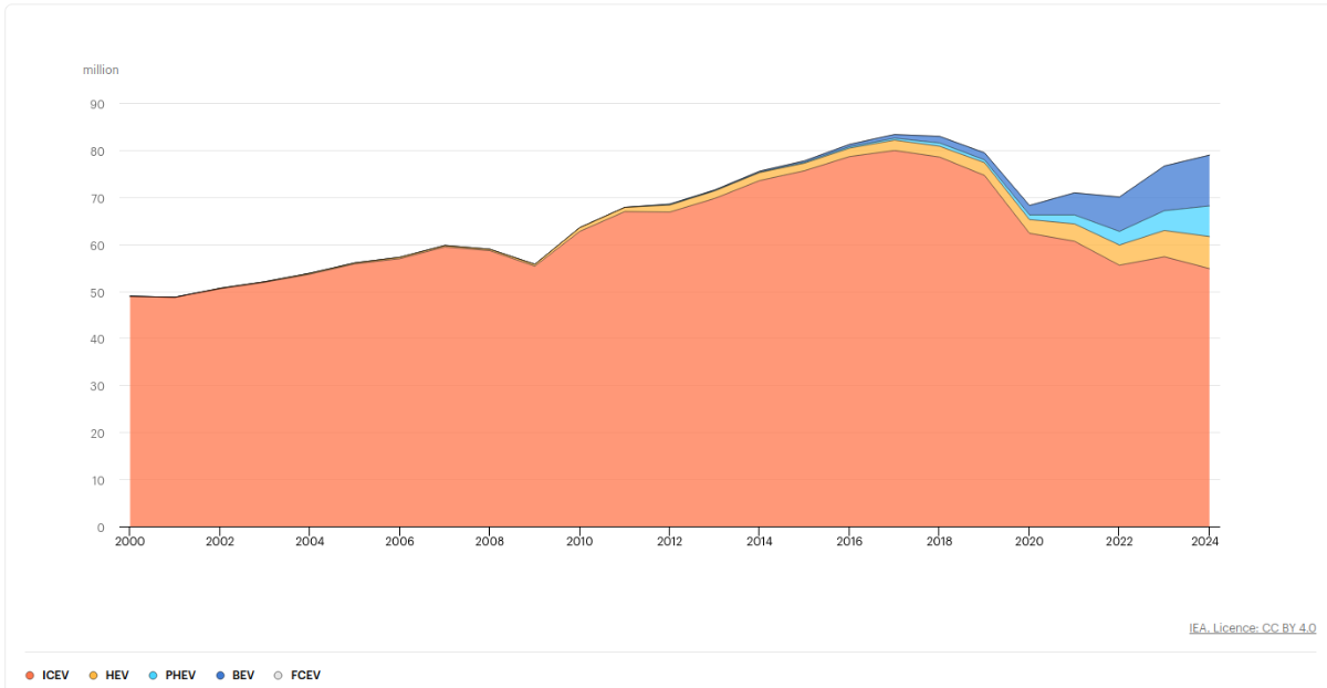 L'agence internationale de l'énergie indique les ventes mondiales de voitures entre 2000 et 2024 : https://www.iea.org/data-and-statistics/charts/global-new-car-sales-by-powertrain-2000-2024 On observe : - une hausse régulière des ventes de VT entre 2000 et 2017 (petit trou crise de 2008). - une légère baisse entre 2017 et 2020, sans aucun rapport avec l'augmentation des ventes de BEV, c'est une baisse globale du marché, probablement amplifiée par Covid - une très légère hausse entre 2020 et 2024 des véhicules fonctionnant avec un moteur thermique (ICEV + HEV + PHEV)), les BEV s'ajoutent pour amplifier la hausse. La seule manière de voir une baisse est de considérer les PHEV comme des voitures électriques. En première approximation, ce qui diminue les ventes de voitures thermiques, ce sont les crises (2008, COVID) et la baisse de la consommation qu'elles induisent. -
