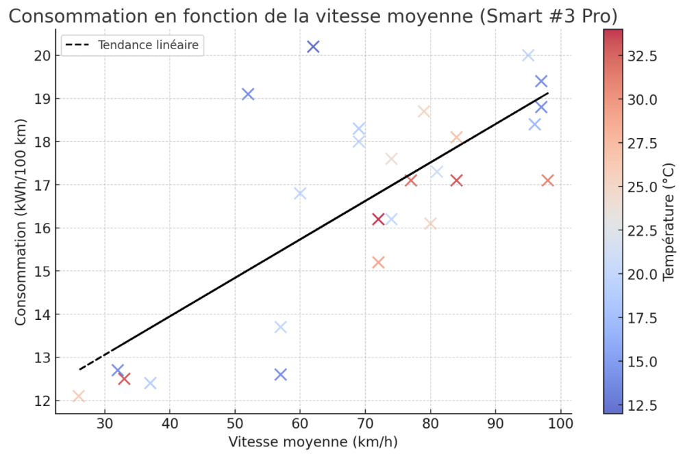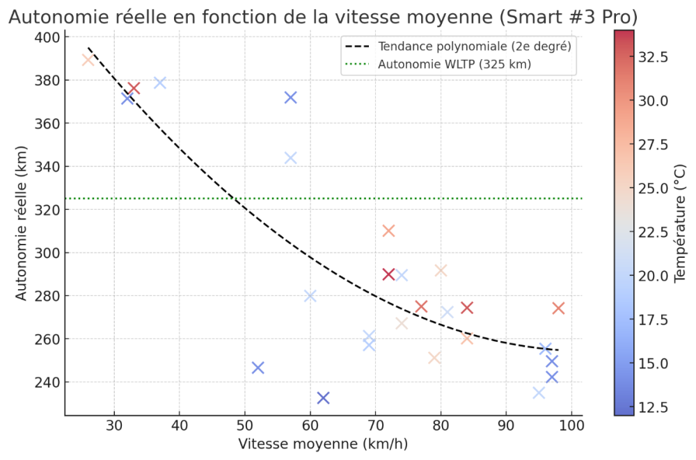 Parce que de longs discours ne valent pas des images, voici quelques données illustrées sur mes 4600km parcourus jusqu’à maintenant avec ma #3 Pro : Graphique 1 : consommation vs vitesse moyene Chaque point correspond à un trajet, coloré selon la température extérieure. La courbe en pointillés noirs montre la tendance linéaire : la consommation augmente clairement avec la vitesse moyenne. Graphique 2: autonomie réelle vs vitesse moyenne Même principe visuel, avec une tendance polynomiale (courbe en pointillés). La ligne verte indique l’autonomie WLTP officielle de 325 km. On voit bien que l’autonomie chute nettement au-dessus de ~80 km/h, surtout sur autoroute. Voici aussi le tableau des autonomies moyennes (en km) par tranche de vitesse et tranche de température : Tranche de vitesse ≤10 °C 10–20 °C 20–30 °C ≥30 °C < 50 km/h — 375,0 389,3 376,2 50–70 km/h — 284,8 — — 70–90 km/h — 289,5 275,5 279,8 90–110 km/h — 245,6 — 274,2