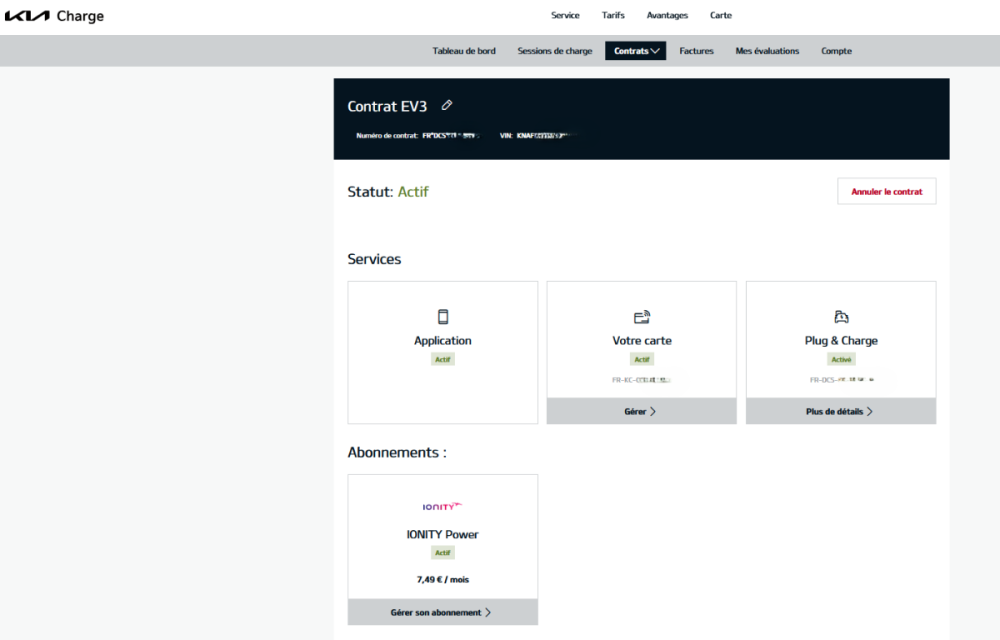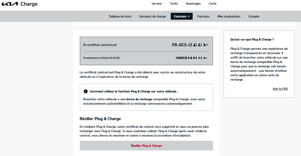 Bonsoir Merleau Quand tu vas sur la page WEB de ton compte KIA Charge / Contrats / Services > est ce que tu as " Plug & Charge" activé avec un numero du type : "FR-DCS-...." ? Quand tu cliques sur "plus de détails" en principe une page récapitulative de ton certificat s'affiche. Tu devrais insister avec l'assistance KIA Charge (01 76 27 68 00) c'est elle qui devrait de donner des nouvelles de l'activation à mon sens aucun rapport avec ton concessionnaire.