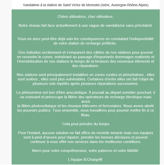 Pas beaucoup de solutions à ce problème ... La video surveillance ne sera pas efficace : le temps que la maréchaussée arrive les malfaiteurs seront partis.. Alternative au cuivre : aluminium, niobium ou graphite : pas sûr que ce soit plus économique même si les vols vont diminuer Un gainage avec une protection rotative qui entoure le cuivre pour empêcher le meulage, je ne sais pas si c'est possible mais ce sera pénalisant pour les clients car le poids sera encore plus important... La recharge par induction serait une possible solution, mais les voitures ne sont pas équipées... Il reste le tir au laser avec surveillance par IA, mais c'est encore de la science fiction... Ou bien il faut revenir à la bonne vieille station service avec du personnel 24h sur 24, avec petit commerce et restauration...Pourquoi pas après tout, mais ce ne sera pas possible partout et impactera forcément les prix au kWh...