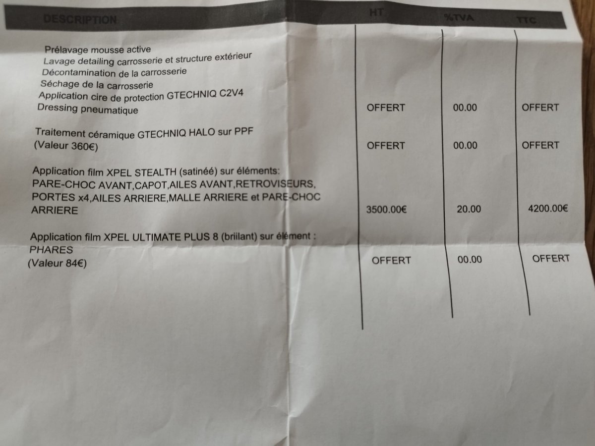 Bonjour la communauté, je réceptionne "normalement" mon véhicule le 11 mars. Du coup on a fait le tour des installateurs de ppf et le mieux qu'on est trouvé ce trouve dans le secteur de Montpellier le mec super sympa. ça sera un ppf brillant XPEL ultimate plus 8 recouvert gracieusement d'un traitement en céramique. Il nous offre même les écrans à l'intérieur top le gars et pour pas trop chère je trouve comparé à d'autre vous trouverez ci-joint le devis c'est pas le même car celui ci est pour le ppf mat mais sinon il offre la même chose. Le ppf est un peu moins chère que pour le mat. 3960€. Du coup on a bloqué pour le 23 mars il pouvait pas avant. Quand pensez vous ? -