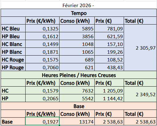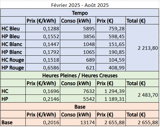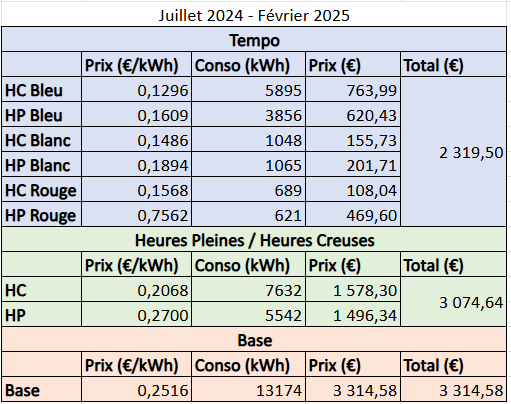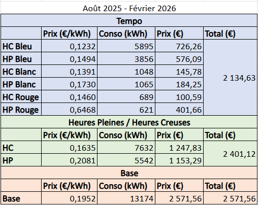 Je vais remettre ici ce que j'avais partagé sur l'autre fil : j'ai récupéré du Linky ma conso sur une année complète (d'octobre à octobre pour avoir les 22 jours rouges) et j'ai simulé ce que donnait cette conso en Tempo vs HP/HC vs Base pour chaque variation des tarifs depuis 2024. On voit quand-même que l'intérêt du Tempo a largement diminué. Dans mon cas il me faisait économiser 700€/an par rapport au HP/HC en 2024 et il n'y a plus que 40€/an avec les nouveaux tarifs (avec exactement la même consommation). Juste avant l'augmentation de Février c'était quand-même encore 270€/an. L'hiver étant terminé je vais le garder pour l'instant mais la question se posera sérieusement avant l'hiver prochain de savoir s'il faut continuer à s'emmerder à décaler les consommations pour 40€/an (surtout s'ils nous refont le coup au mois d'août). Le but initial du Tempo est d'inciter à décaler les consommation pour aider à piloter la charge au lieu de seulement piloter la production. On demande un effort d'organisation en échange d'un tarif moins élevé au global. L'argument pour justifier l'augmentation de dire "oui mais en moyenne les gens en Tempo payent moins que les autres c'est injuste" n'a absolument aucun sens : heureusement qu'ils payent moins que les autres en moyenne c'est le but. Si on finit par payer autant en Tempo à quoi bon rester en Tempo ? -