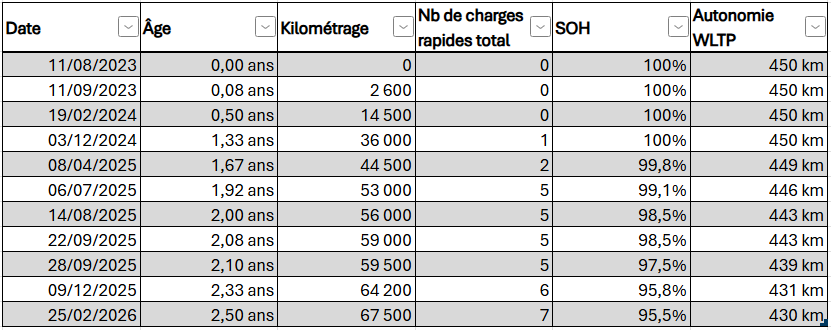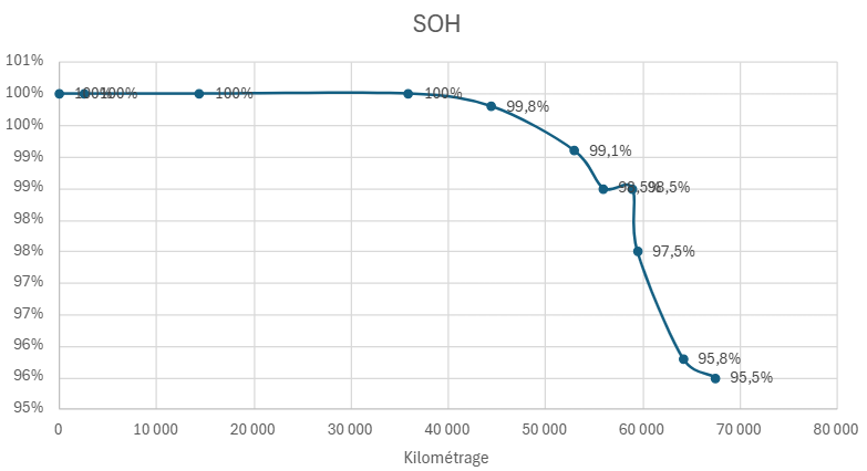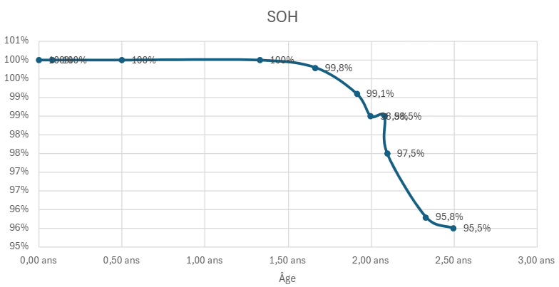 Update de mon suivi du SOH : J'ai l'impression qu'on commence à voir la pente s'adoucir, si la nouvelle pente est la norme pour la suite comme ça devrait être le cas après la dégradation forte du début, ça donnerait à la louche 0,13%/mois soit 1,56%/an soit 80% de SOH dans 10ans. À voir si cette nouvelle pente se confirme dans les prochains mois.