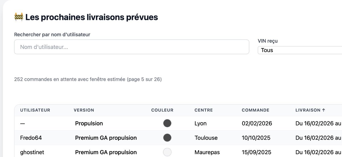 Addendum: je verrai bien un truc du style: - les "prochaines livraisons confirmées" (avec la DATE de livraison confirmée) ou "prochaines livraisons avec date confirmée" - les "prochaines livraisons supposées" (avec la PLAGE de livraison confirmée) ou "prochaines livraisons avec plage de date" (tandis que "livraisons confirmées" devrait s'appeler "livraisons effectuées"). Car là, je voulais voir quelles étaient les prochaines livraisons confirmées, c'est compliquée d'avoir l'info. Et ça serait un vrai PLUS. Déjà plus de 200 inscrits, c'est top ! Une solution pour envoyer un email à la personne dont la plage est dépassée, pour lui demander de mettre à jour ?...
