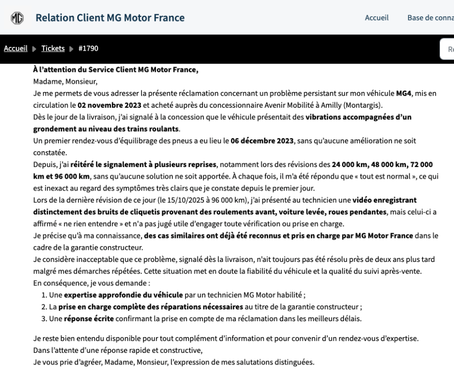 Bon bah le "technicien" ne voit rien et n'envisage pas de mener d'investigations plus approfondies (sauf si je viens faire changer mes pneus avant chez lui......... chantage ?). Pour être tout à fait honnête, j'ai constaté beaucoup moins de vibrations sur un court trajet après la révision. Le fluide du réducteur à été remplacé. Un lien ? Peut-être ! Je verrais ça demain plus précisément, car je vais faire encore pas mal de route. Ca n'enlève toutefois pas mon problème de roulements. Par conséquent, j'ai ouvert un ticket auprès du service relation client de MG France afin de faire reconnaitre mes récriminations comme légitimes, merde ! -
